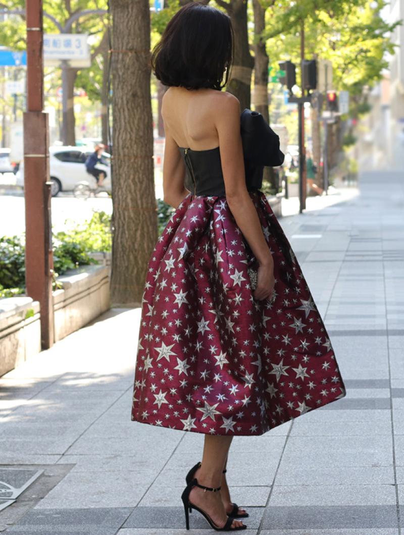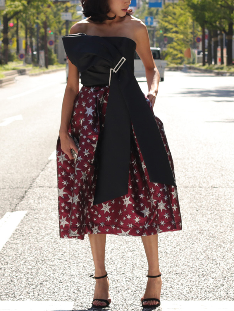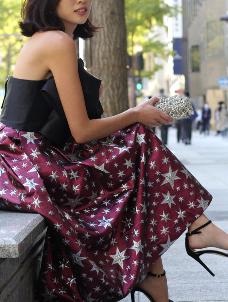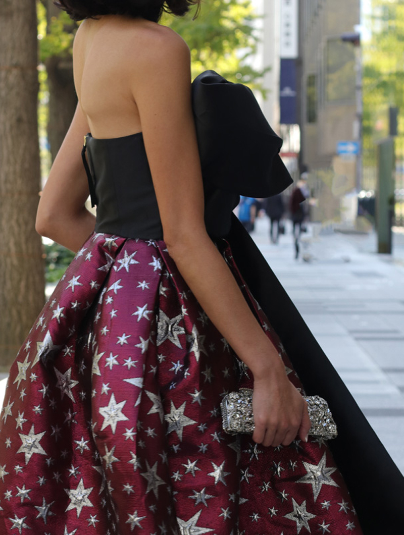 星柄がプリントされたボリューム感のあるドレスはお召しになると特別な気分にさせてくれます。