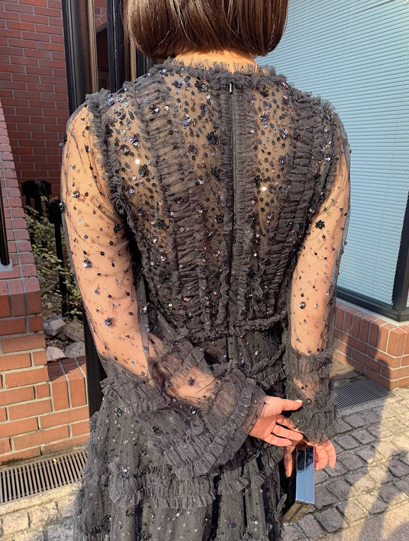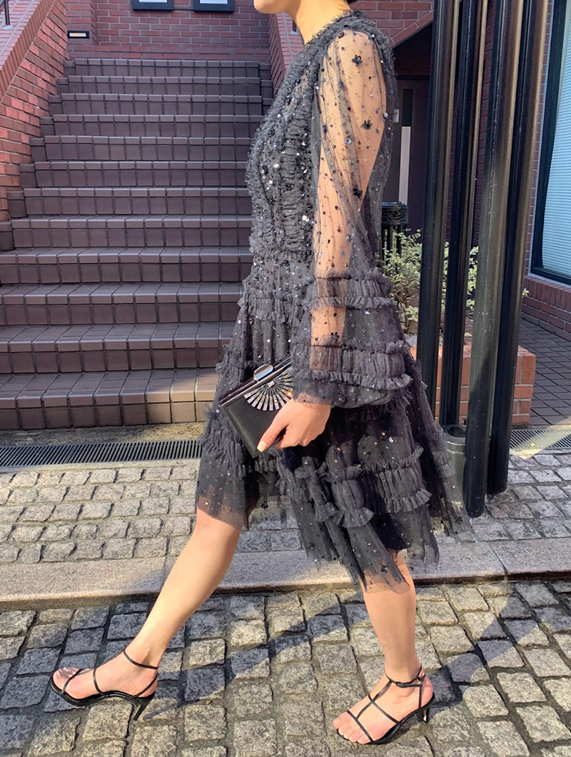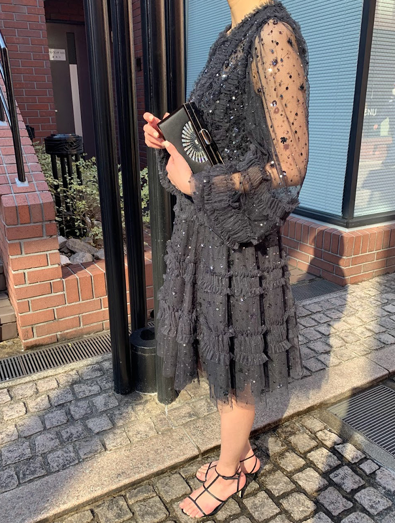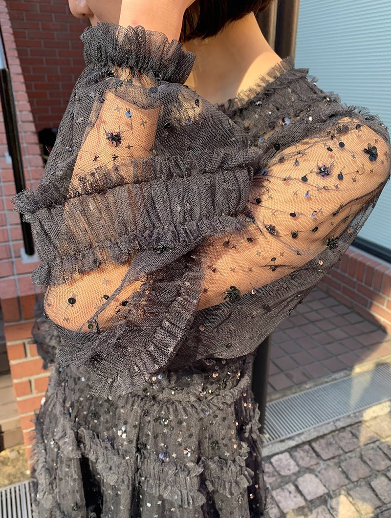 動くたびスパンコール刺繍がきらめくチュールのミニドレス。スリーブは透け感のあるロングパフスリーブで気になる腕周りをカバーしてくれます。ブラックカラーで落ち着いた印象ながらも、チュールを巧みに用いたラグジュアリーなデザインで華を添えてくれる一着です。163cmの方が6cmヒールを履いて膝上くらいの丈のドレスです。