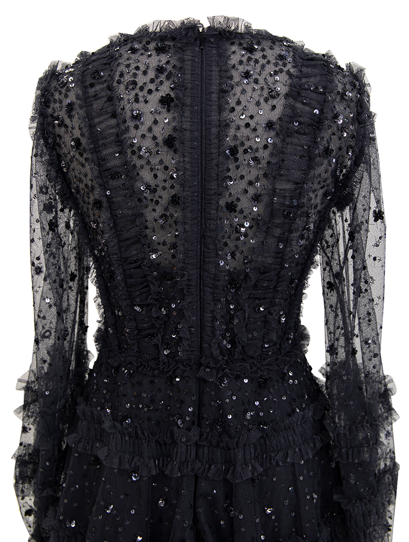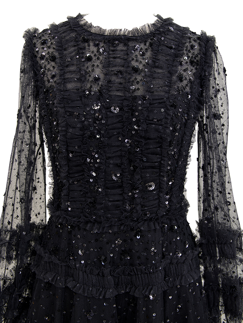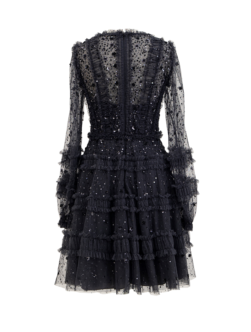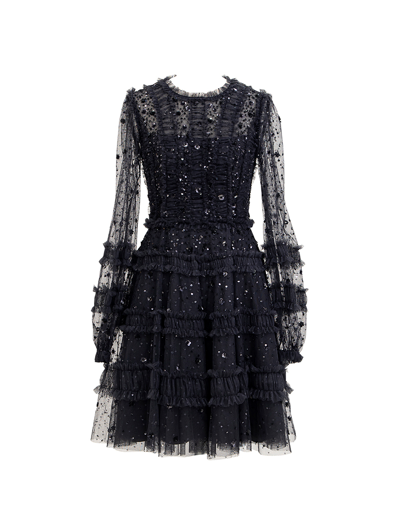 動くたびスパンコール刺繍がきらめくチュールのミニドレス。スリーブは透け感のあるロングパフスリーブで気になる腕周りをカバーしてくれます。ブラックカラーで落ち着いた印象ながらも、チュールを巧みに用いたラグジュアリーなデザインで華を添えてくれる一着です。163cmの方が6cmヒールを履いて膝上くらいの丈のドレスです。