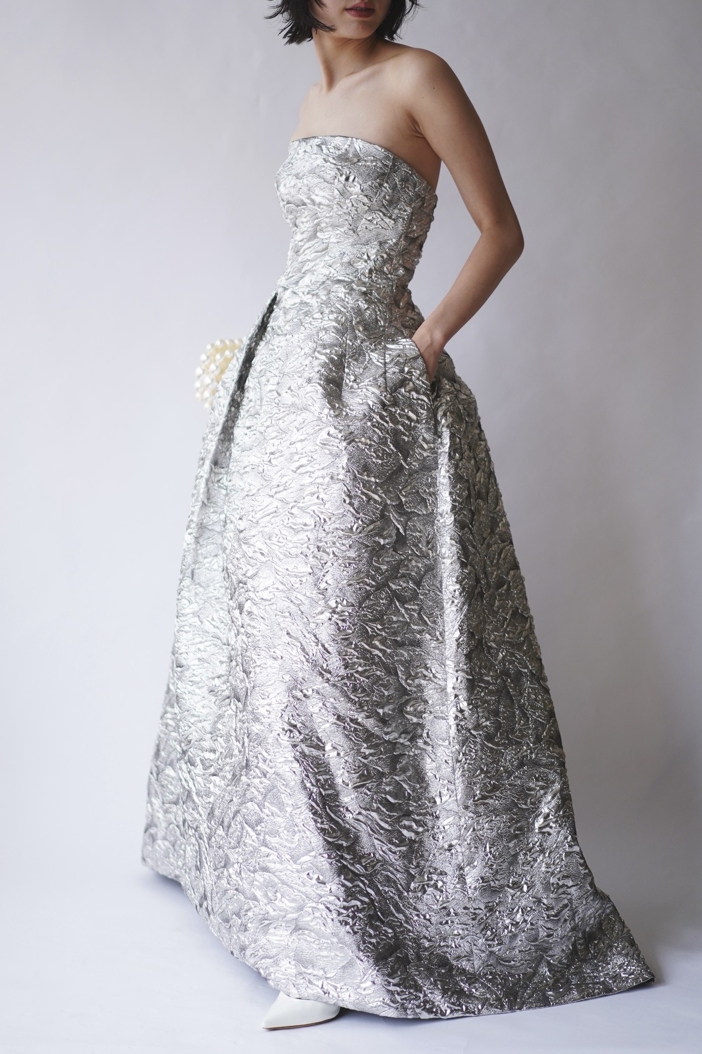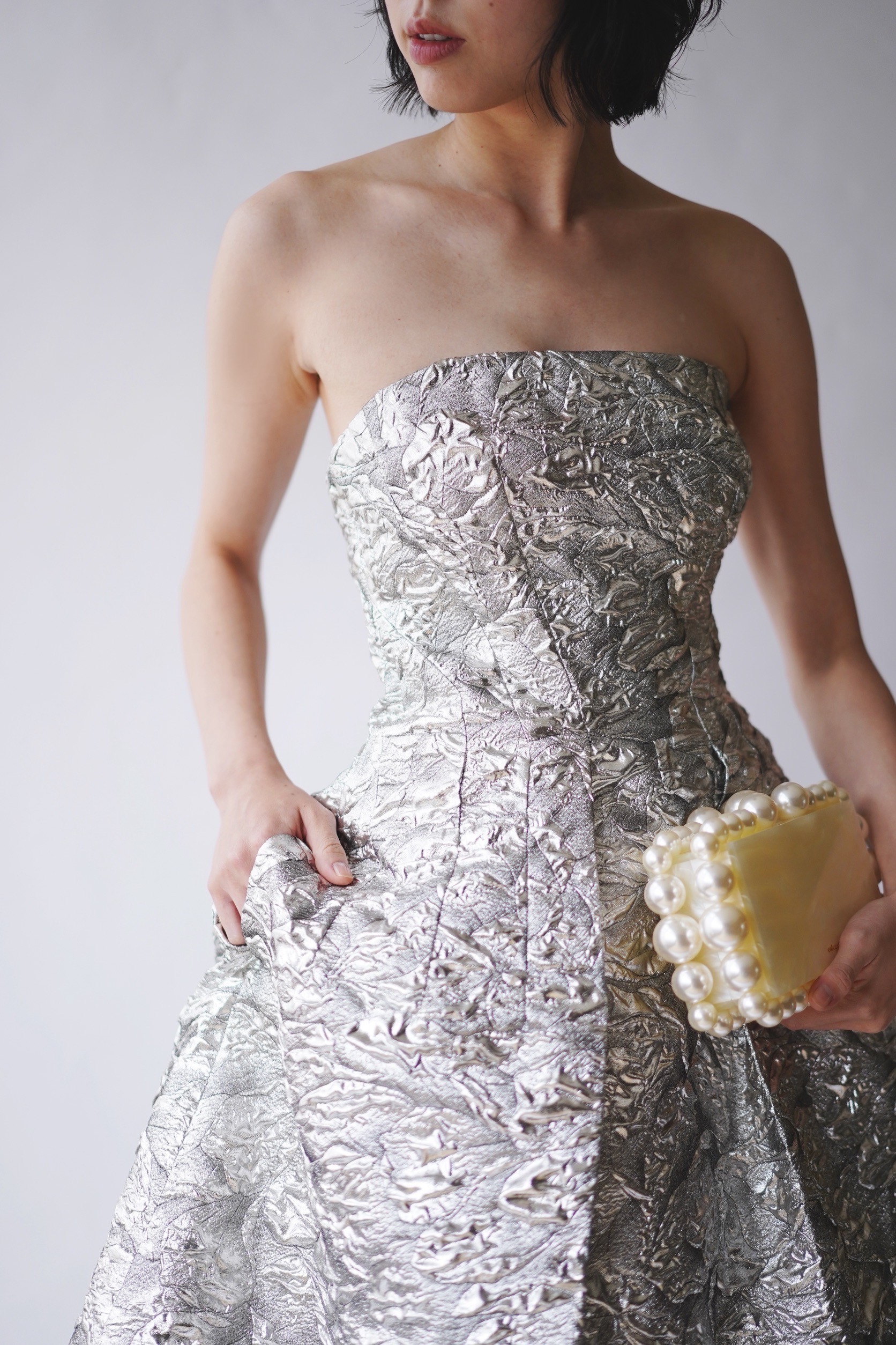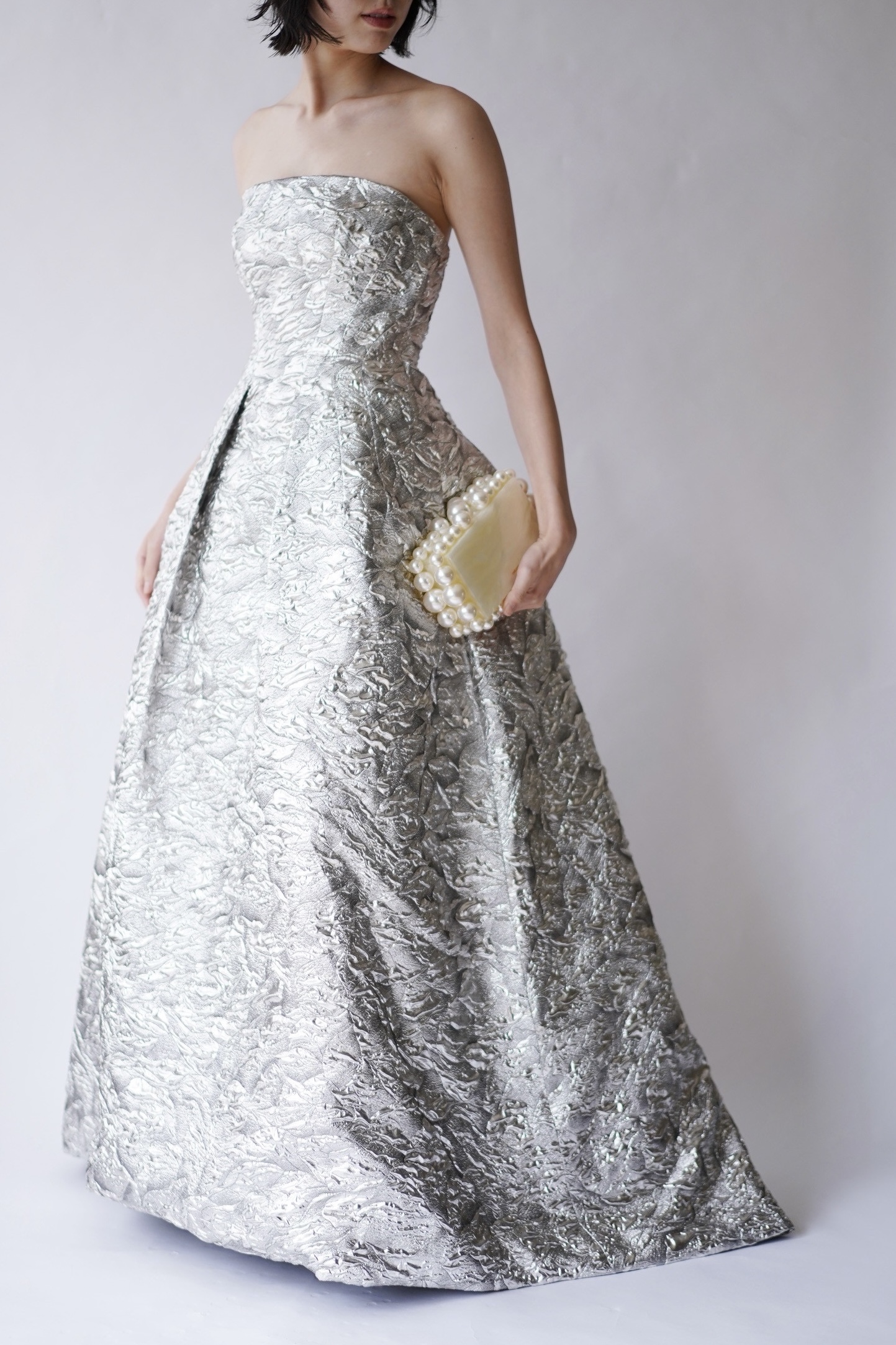 シルバーのメタリックジャガードが目を惹く1着。シルバーに輝くジャカード生地とリュクスなボリューム感が印象的で、記憶に残るドレスアップを叶えてくれます。ボディ部分は、しっかりとしたボーンと中ゴム入りの構築で、ストラップレスながらしっかりとしたホールド感があり安心感がございます。結婚式の二次会や前撮りのドレスとしても是非。