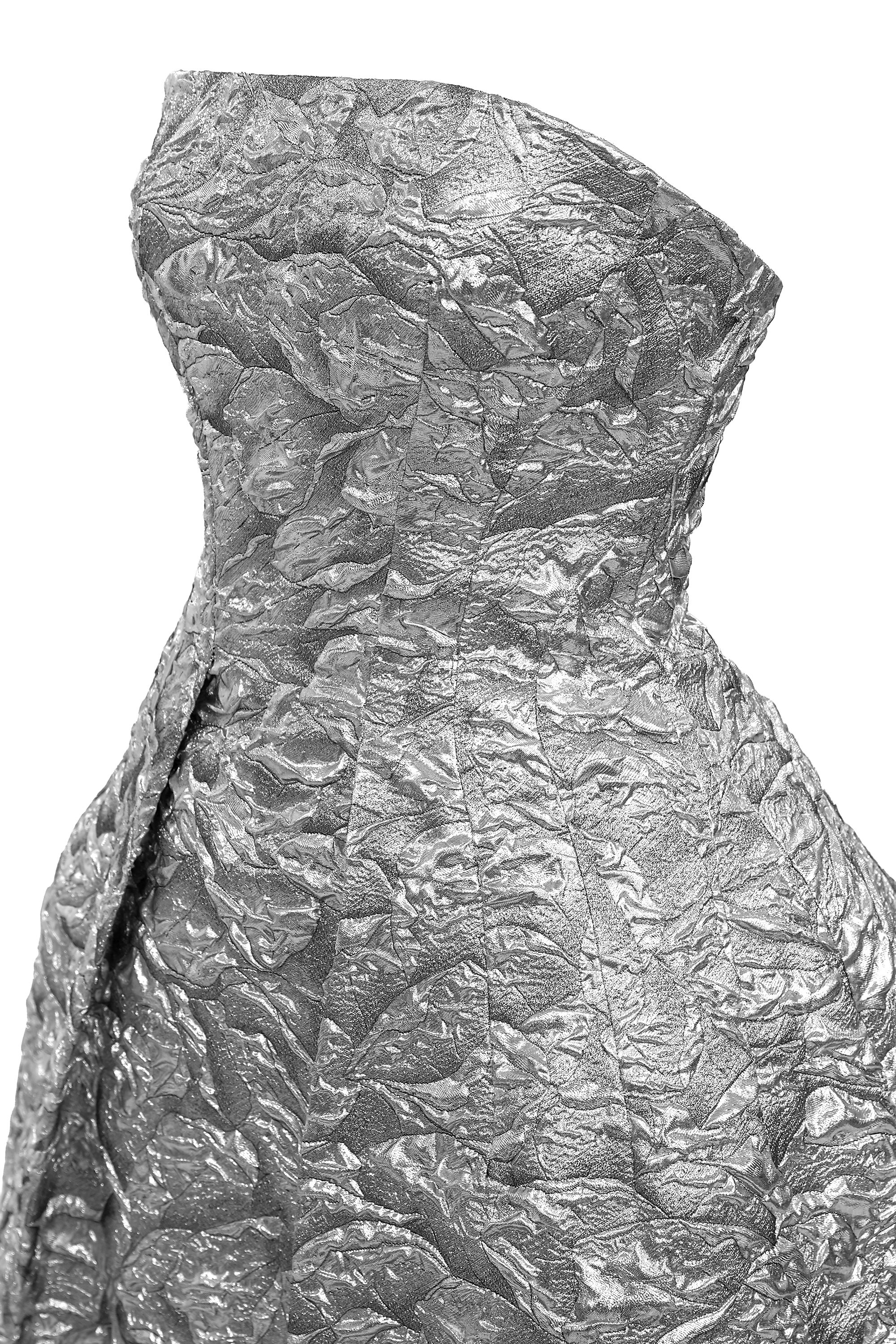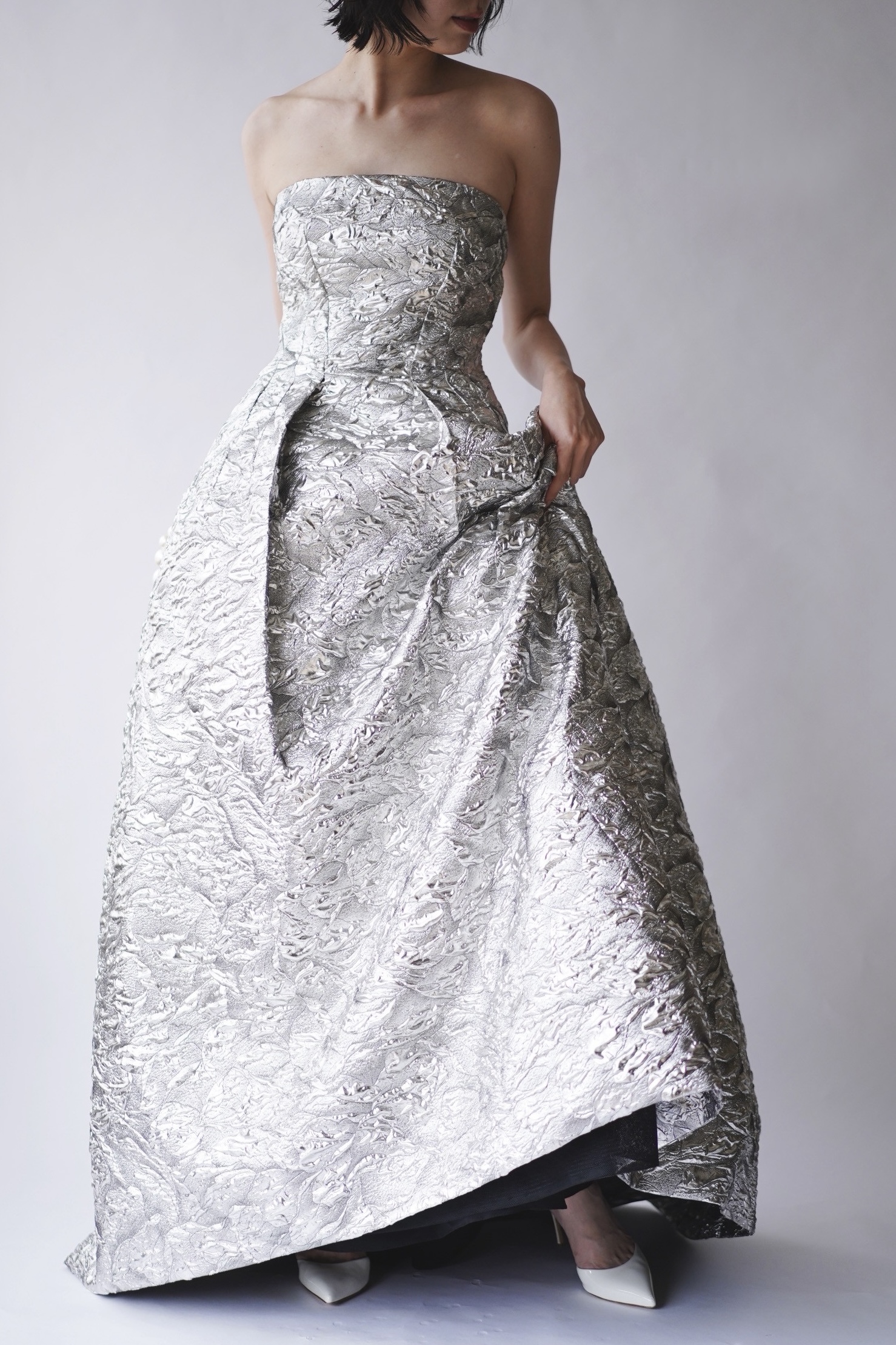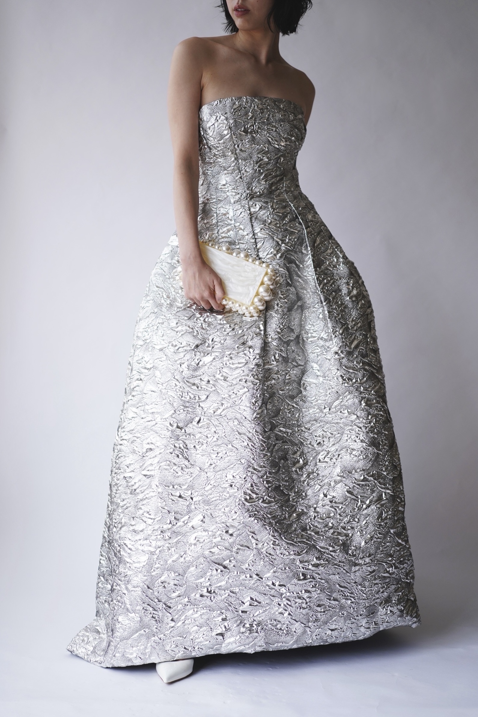 シルバーのメタリックジャガードが目を惹く1着。シルバーに輝くジャカード生地とリュクスなボリューム感が印象的で、記憶に残るドレスアップを叶えてくれます。ボディ部分は、しっかりとしたボーンと中ゴム入りの構築で、ストラップレスながらしっかりとしたホールド感があり安心感がございます。結婚式の二次会や前撮りのドレスとしても是非。