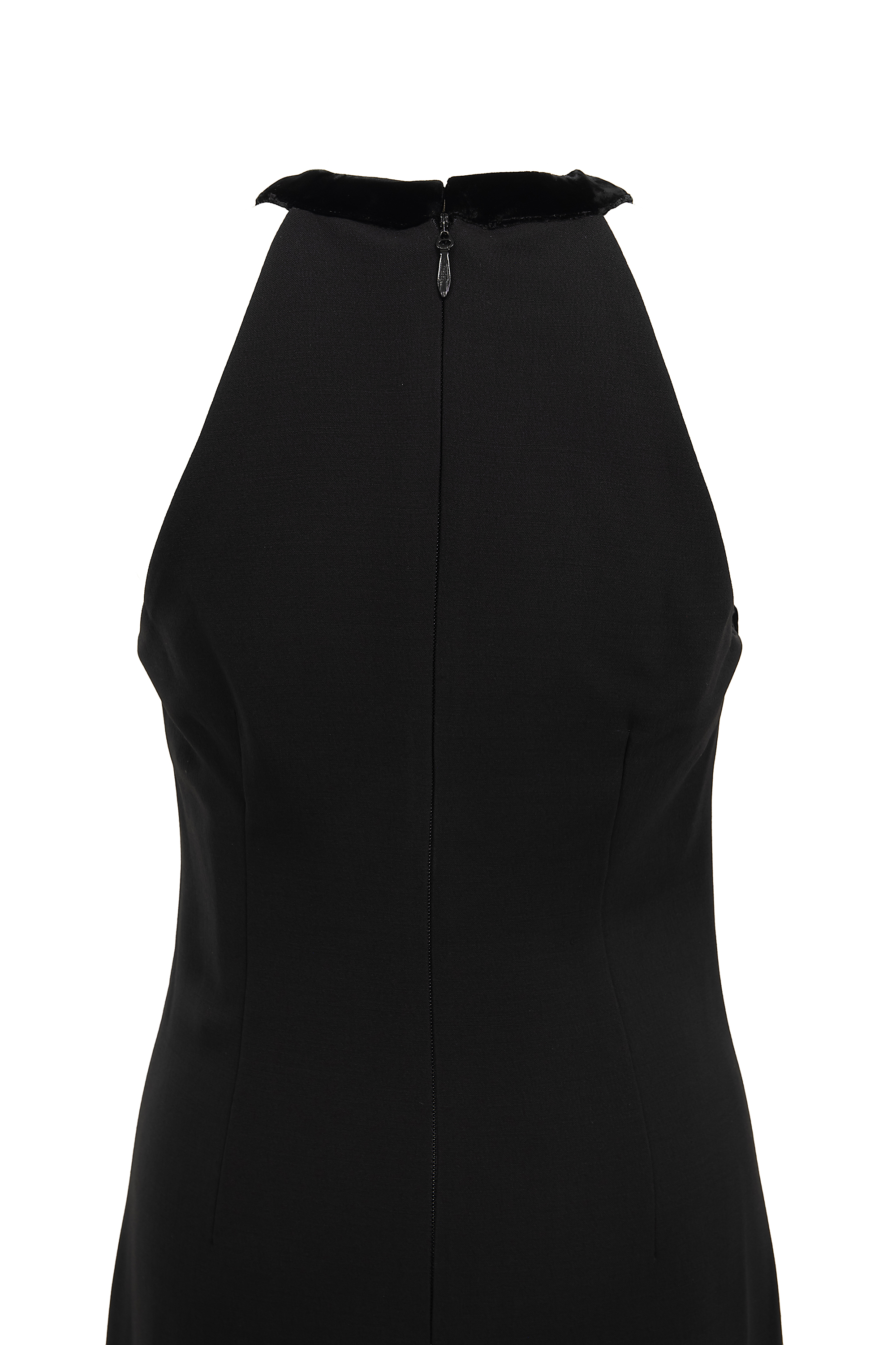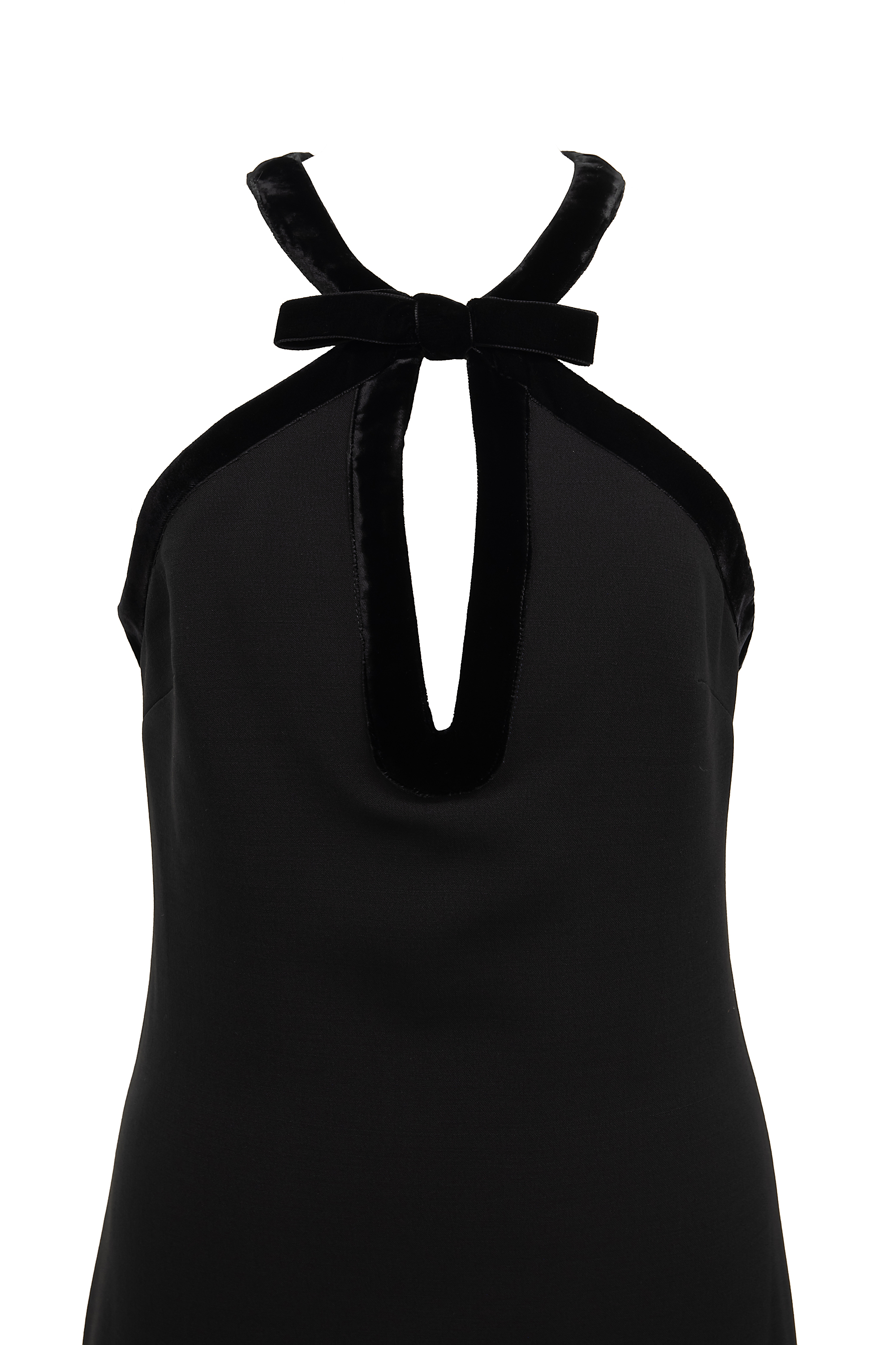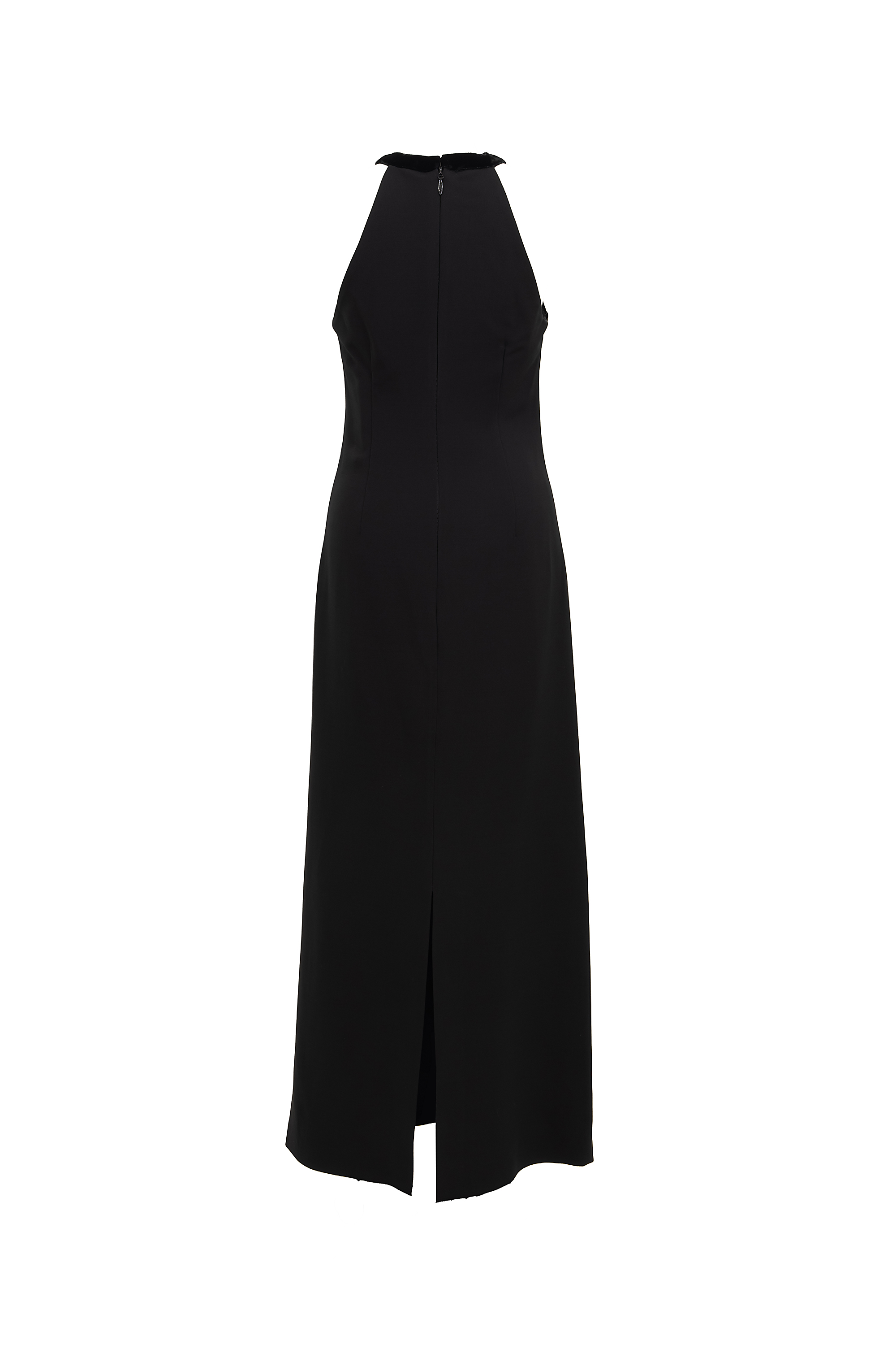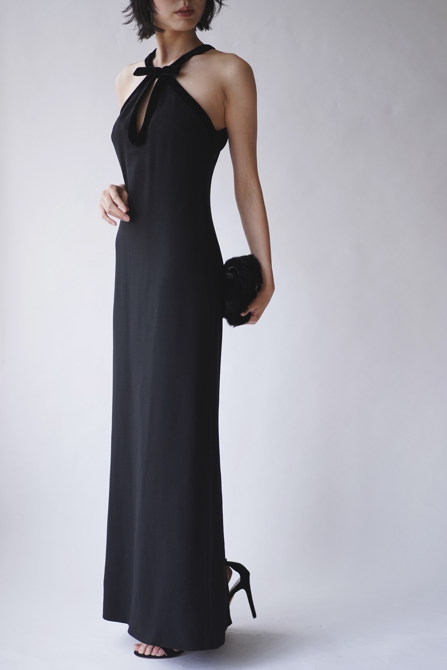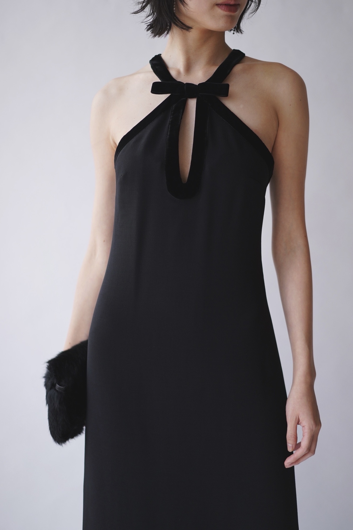 ホルターネック部分に施された“キーホール”デザインがデコルテを美しく演出し、ベルベットトリムが程よい高級感をプラスします。光沢感を演出するベルベットと、ドレープ感のあるドレスの素材使いも上品な印象。