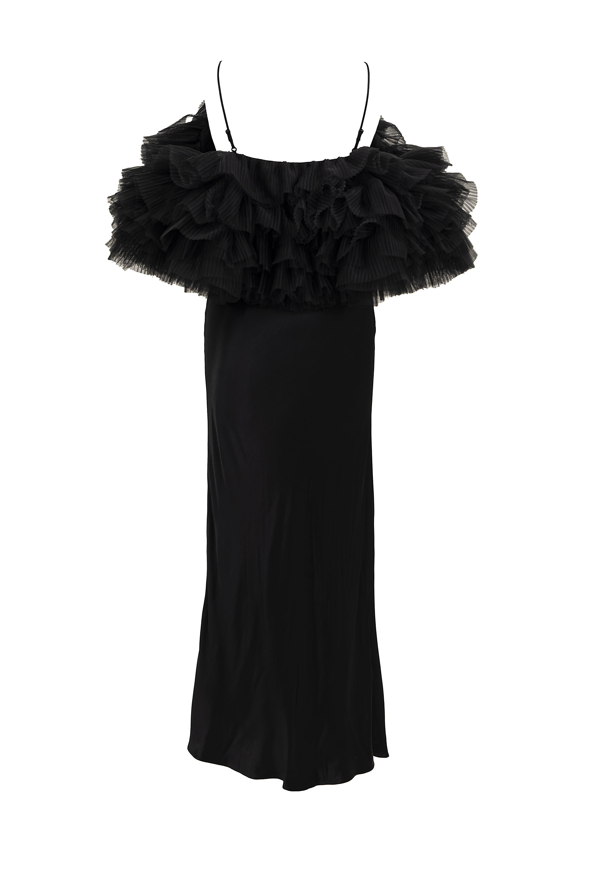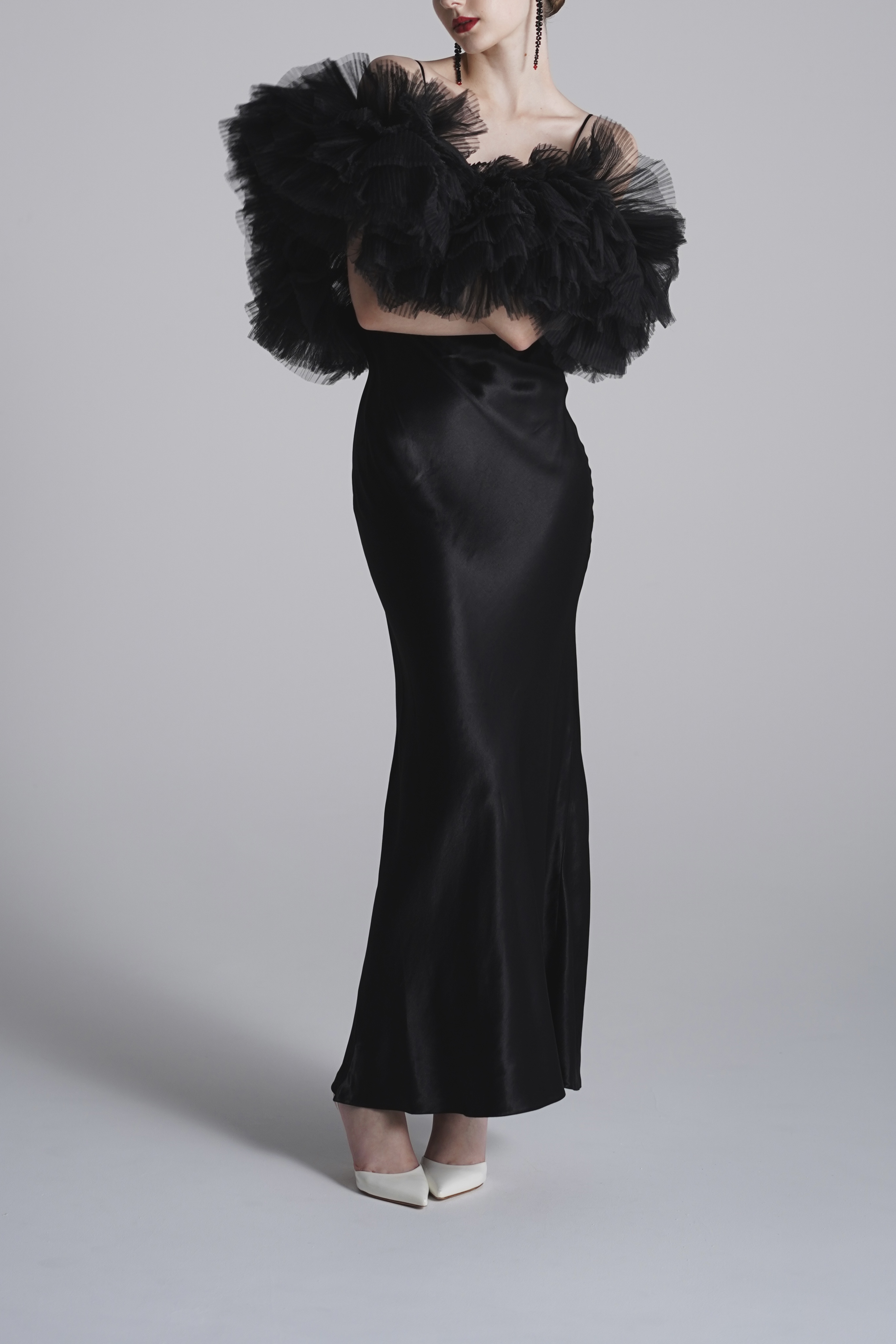 大注目の主役感ドレス。結婚式の2次会やウェディングフォトにもおすすめの1着。肩のスパゲッティストラップがデコルテを華奢に見せてくれ、ビックボリュームのチュールオフショルダーはウエストラインを綺麗に演出いたします。