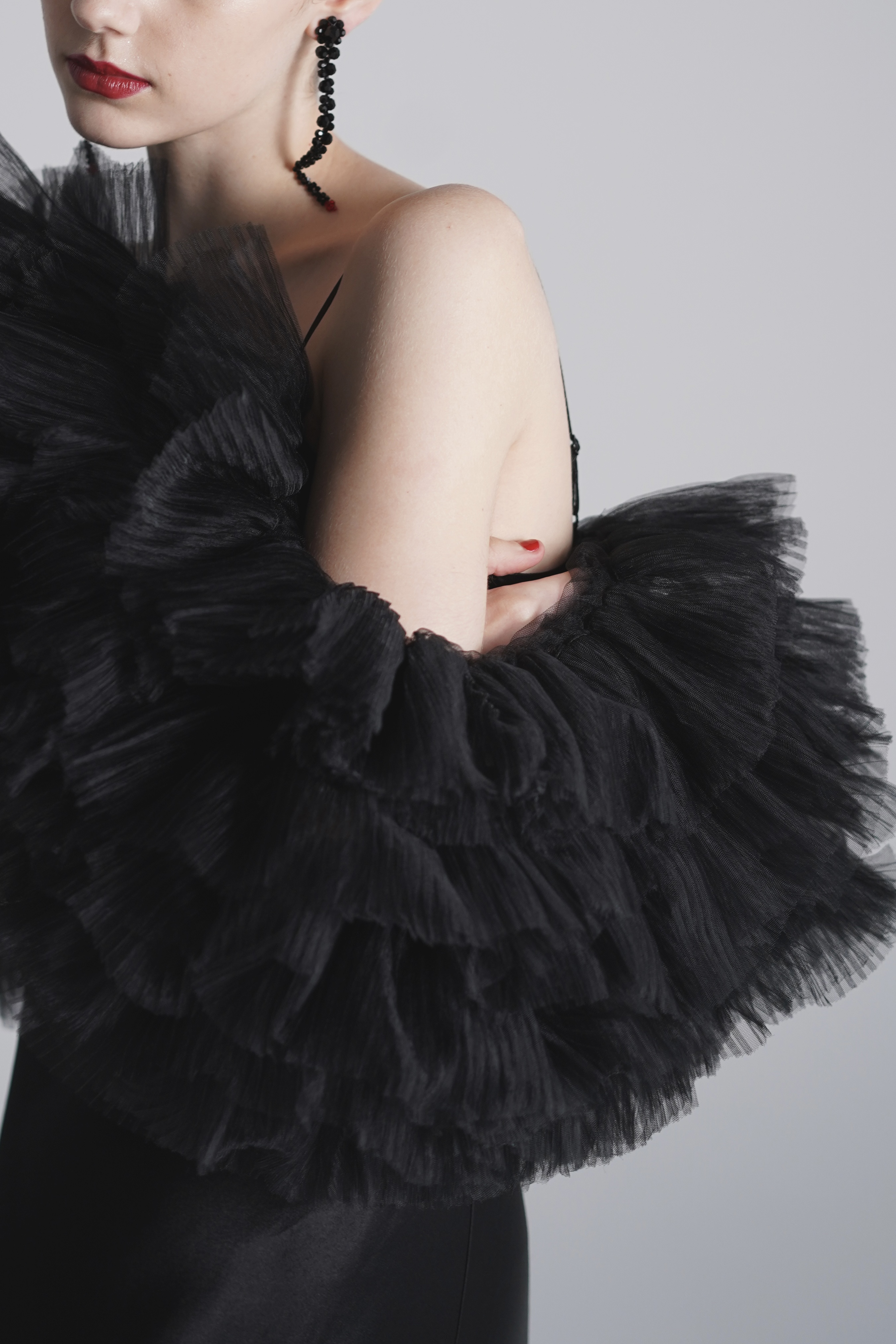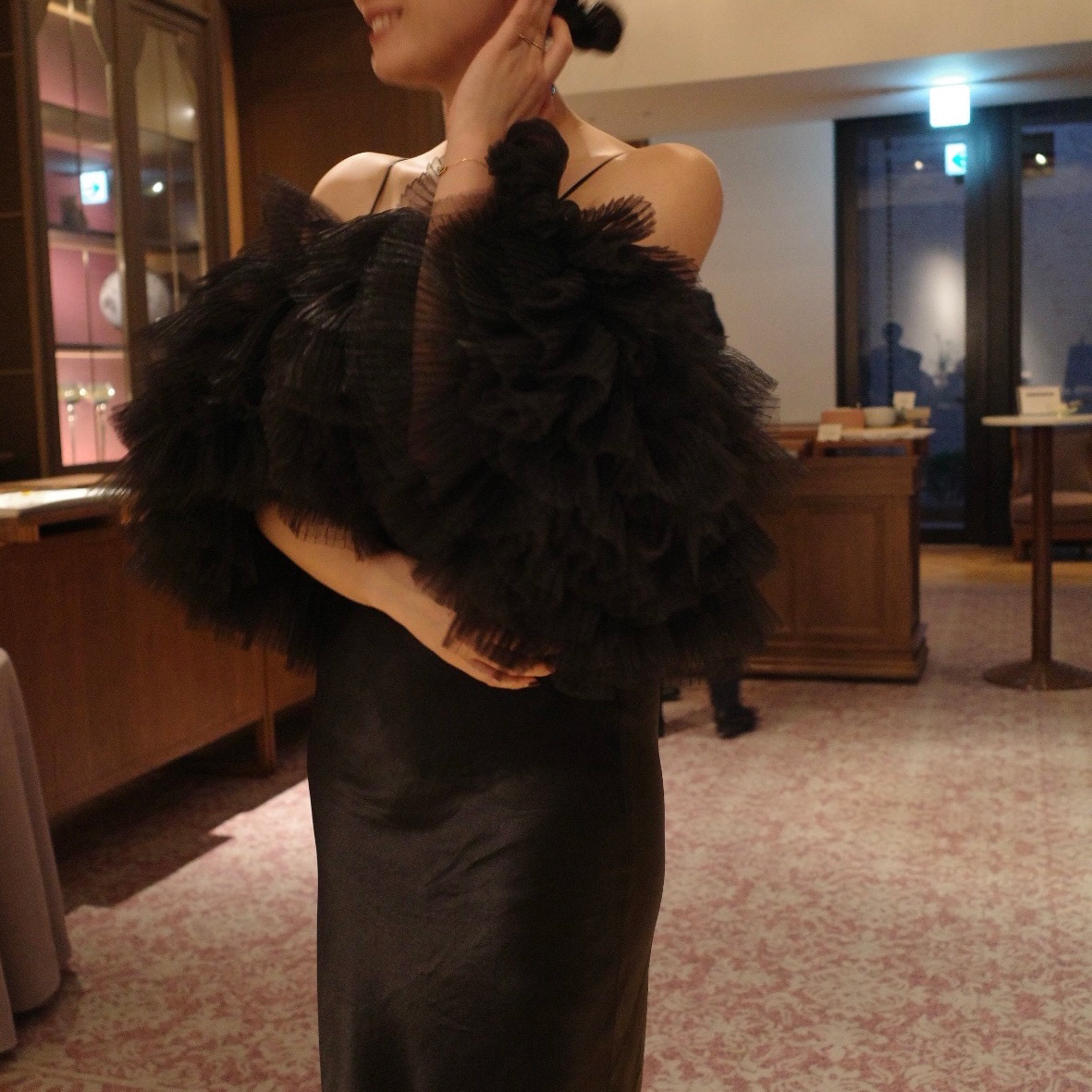 とにかく可愛かったです♡ サイズ感はジャストですごく綺麗なシルエットでした。 丈感についてはいつもワンピースだと短くなりやすいので 心配でしたが短くなりすぎず、とてもちょうどいい丈感でした! 肩のストラップで調整もできるので安心できます。 肩幅がしっかりしている方なので、チュールのふわふわがゴツく見えないかも 心配しておりましたがそんなことなく、逆にいい仕事をしてくれてました。 胸元・肩回りがふわふわしているのでガーデン式でしたが、暖かく感じました。笑 とくにふわふわなチュール部分もチクチクすることもなく、着れました! 全体的に生地がとっても柔らかく、着心地がすごくよかったです。 その分シワになりやすいので到着後、ハンガーにすぐかける方がいいかなと思います。 ただ、着用後に鏡で前と後ろを見てもシワは目立っていませんでした! 総じてとても着心地がよく、ブラックですがとても華やかになるので すごく素敵なドレスでした!