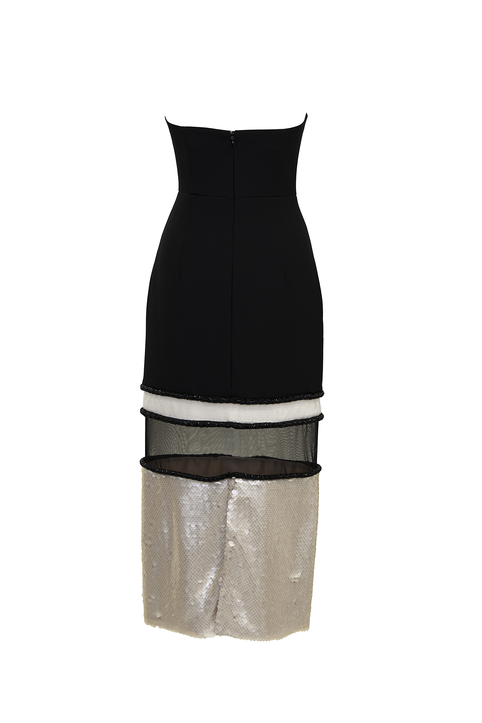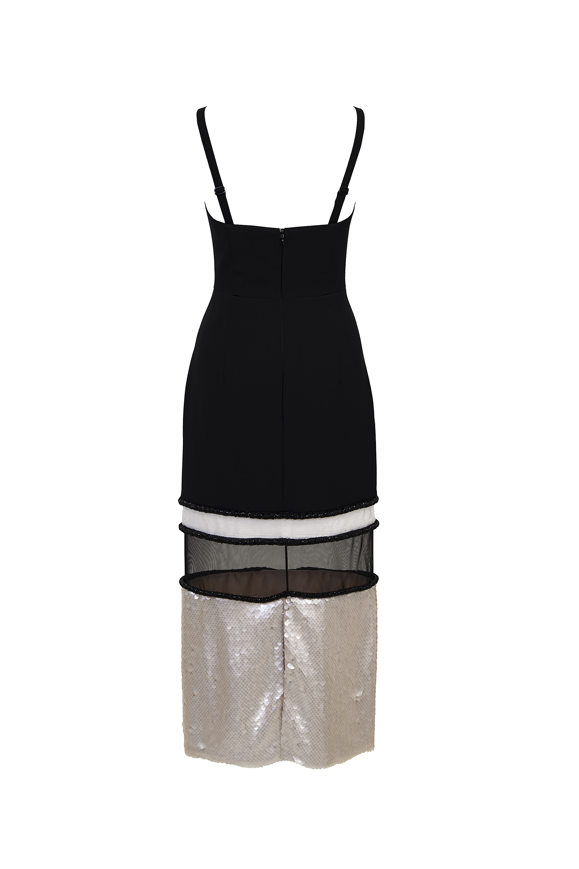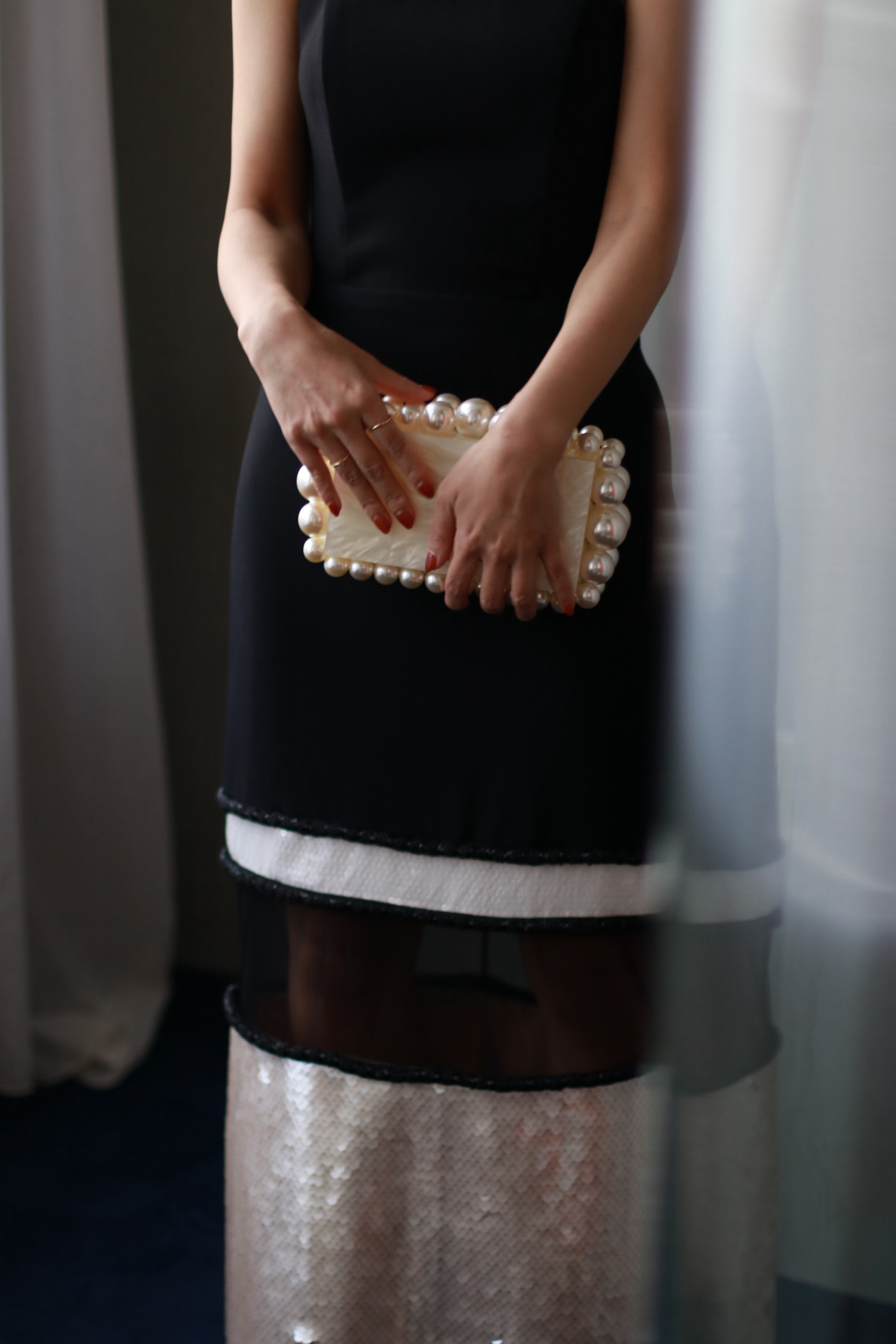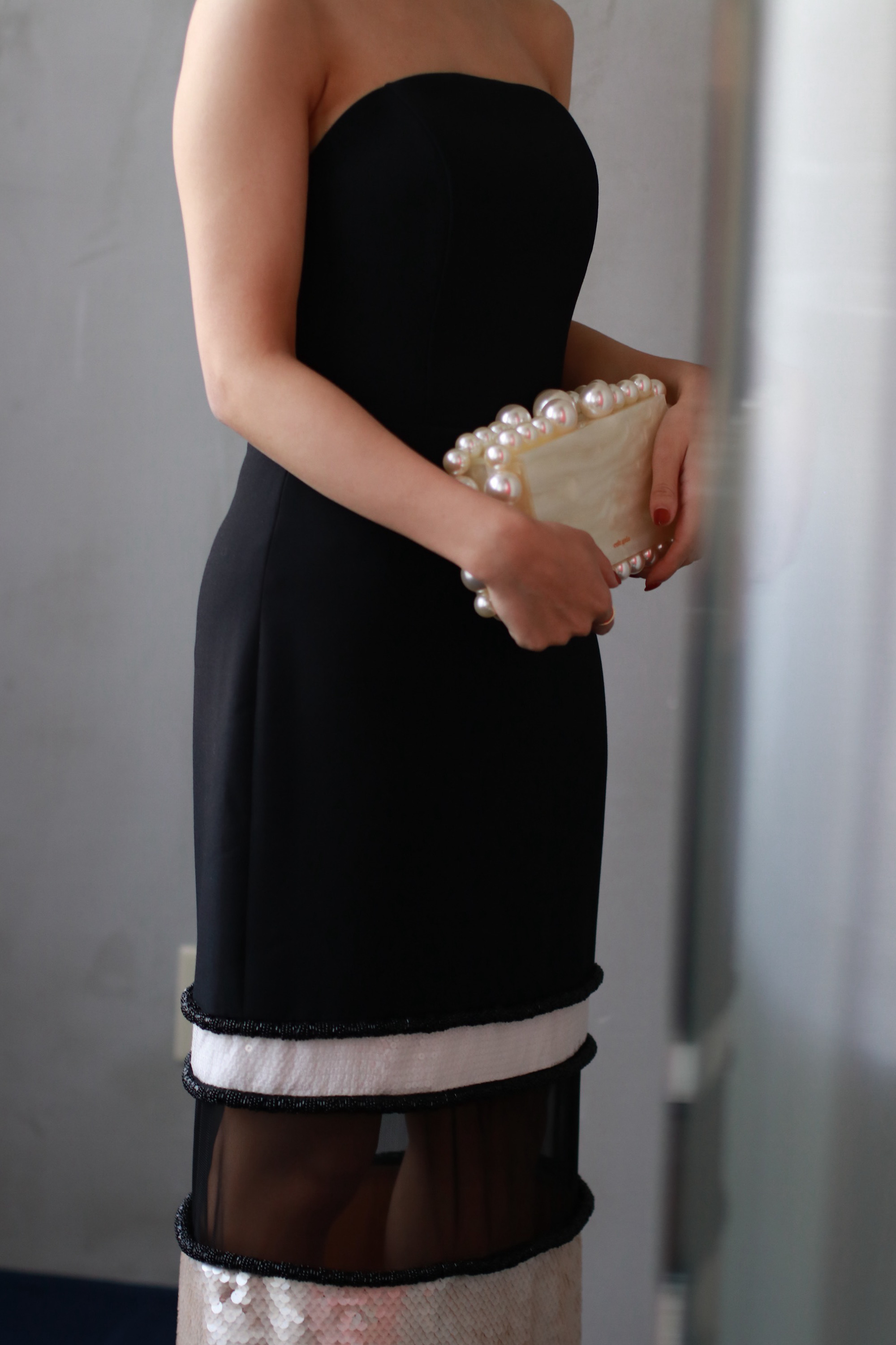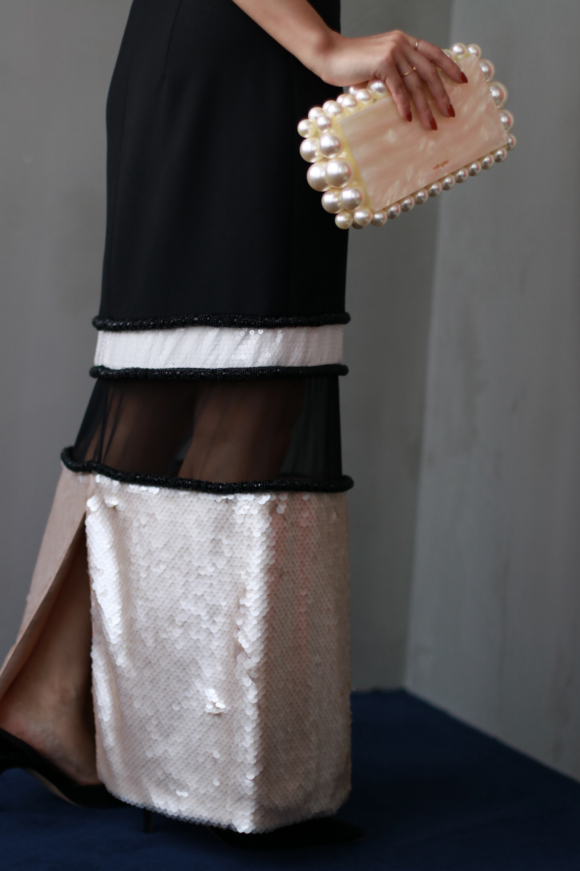 伸縮性のある柔らかなクレープ生地がボディラインを美しく引き立たせる1着です。ひざ下が透け感のあるチュールとスパンコールがレイヤーになっているスカートデザインが、パーティーにぴったりの華やかなドレスです。ジャケットと合わせても素敵なドレスです。152cmの身長で5cmヒールで引きずらない程度の丈感です。バックスリットが入っており、シューズがのぞくデザインです。