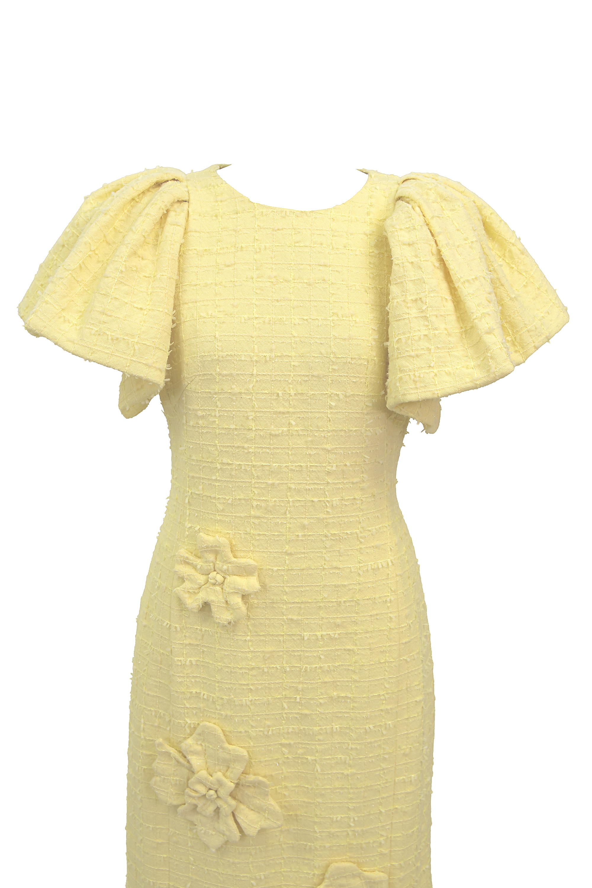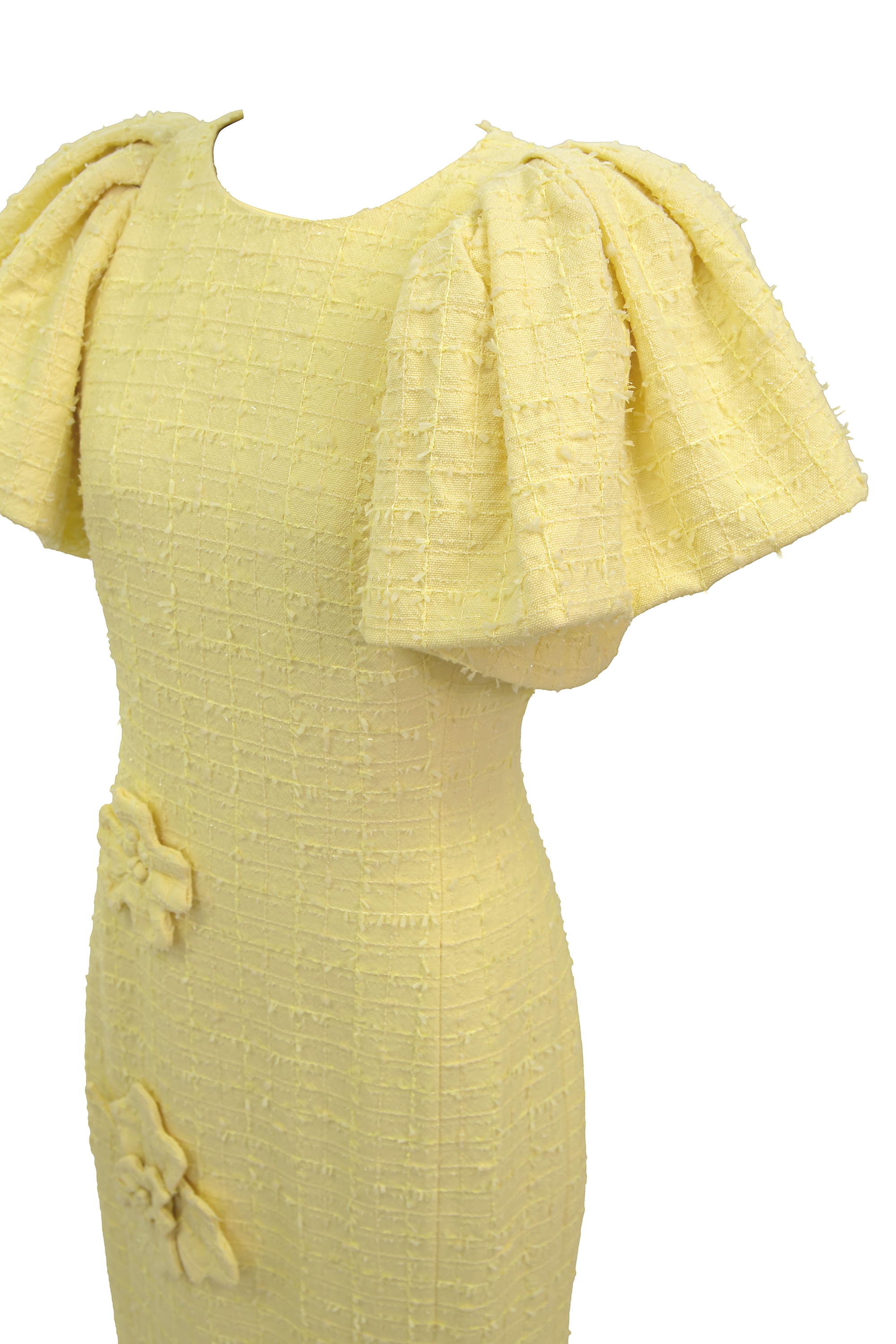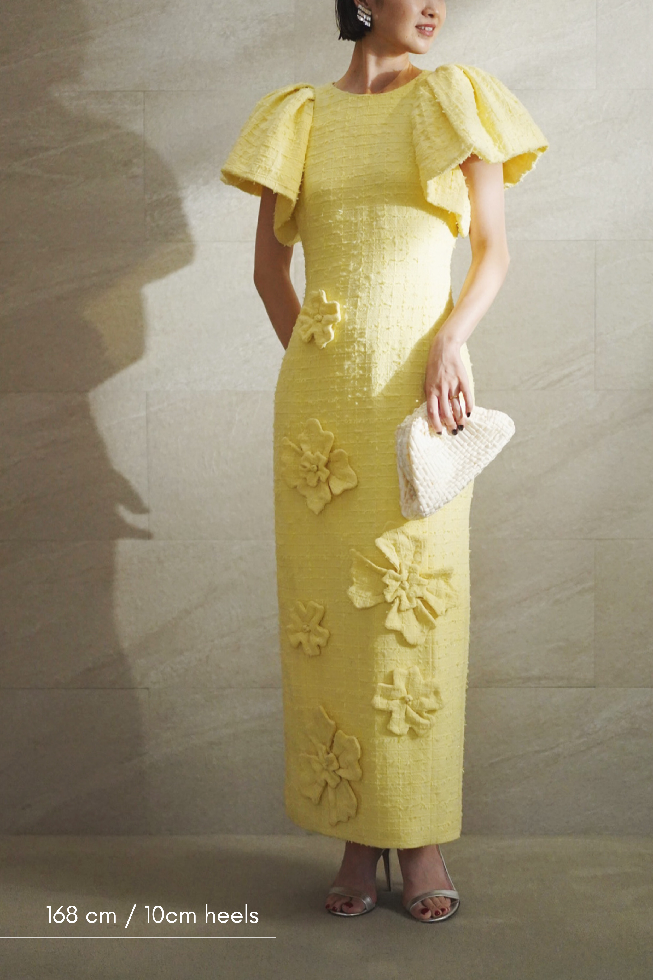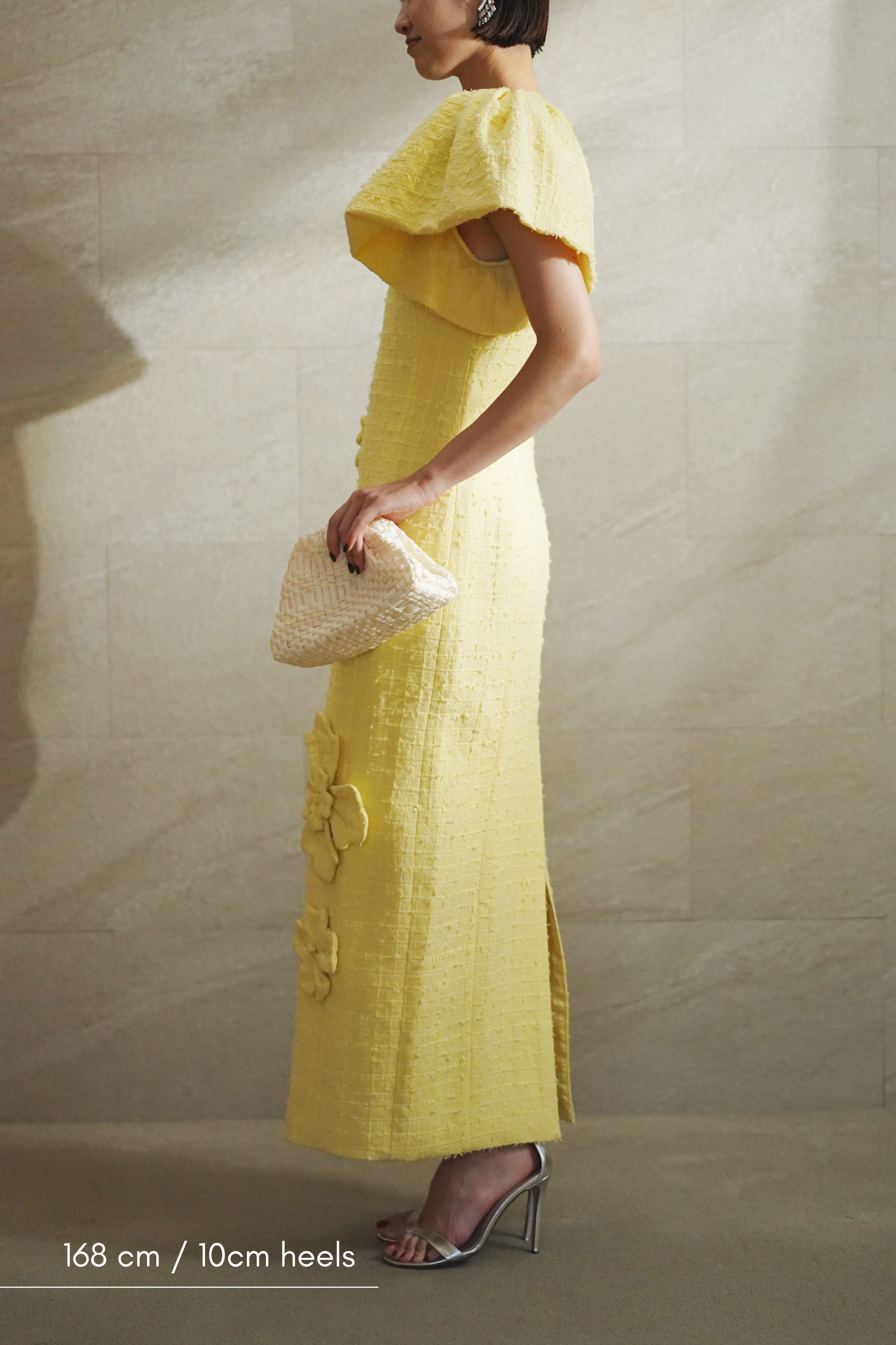 ペールイエローのツイード生地に、華やかなフローラルアップリケが映える一着。 少しフォーマルなランチ会から、華やかな写真を残したいイベントまで、幅広いシーンでお楽しみください。