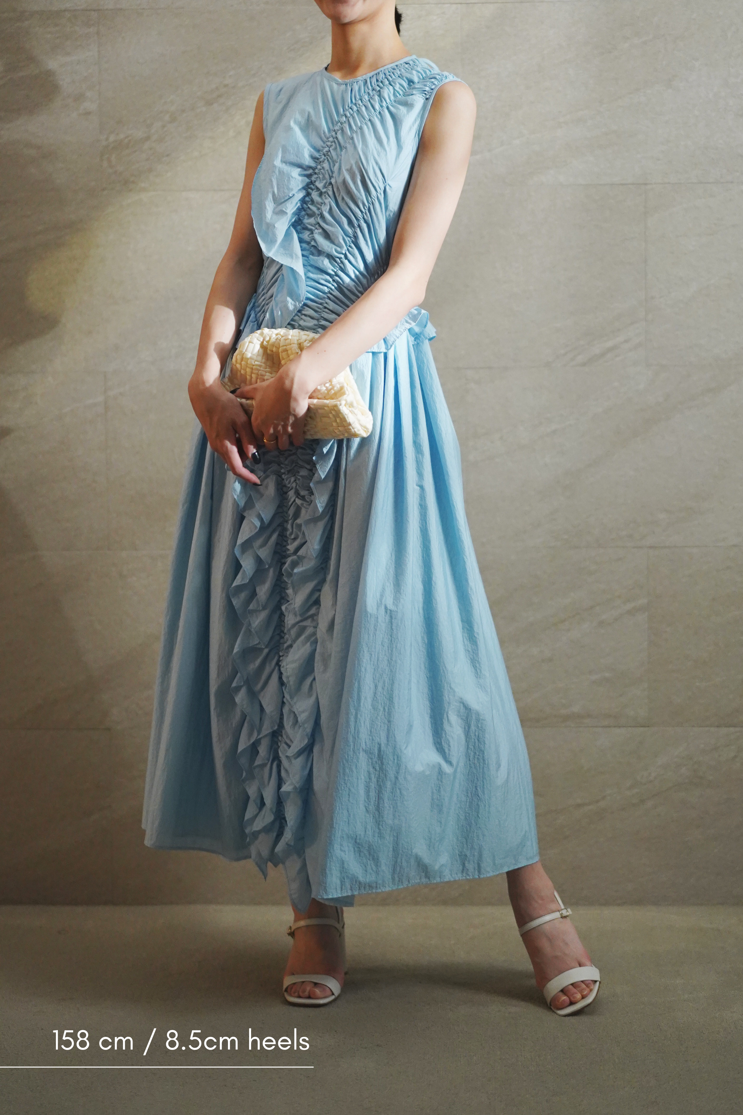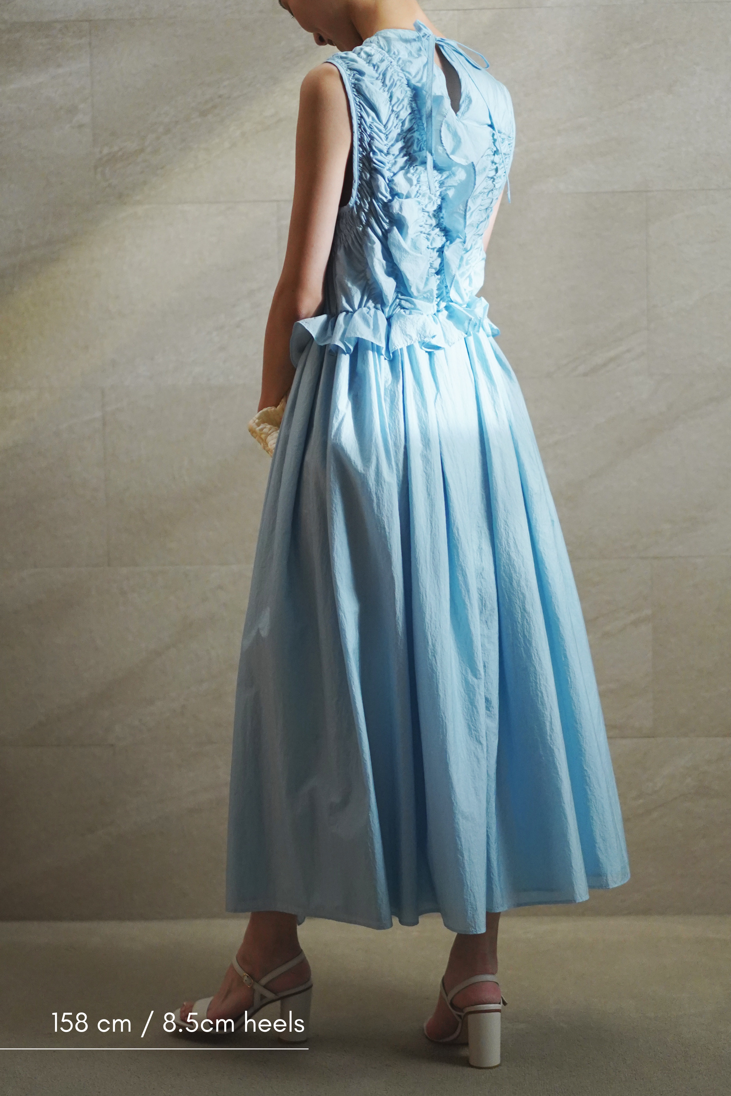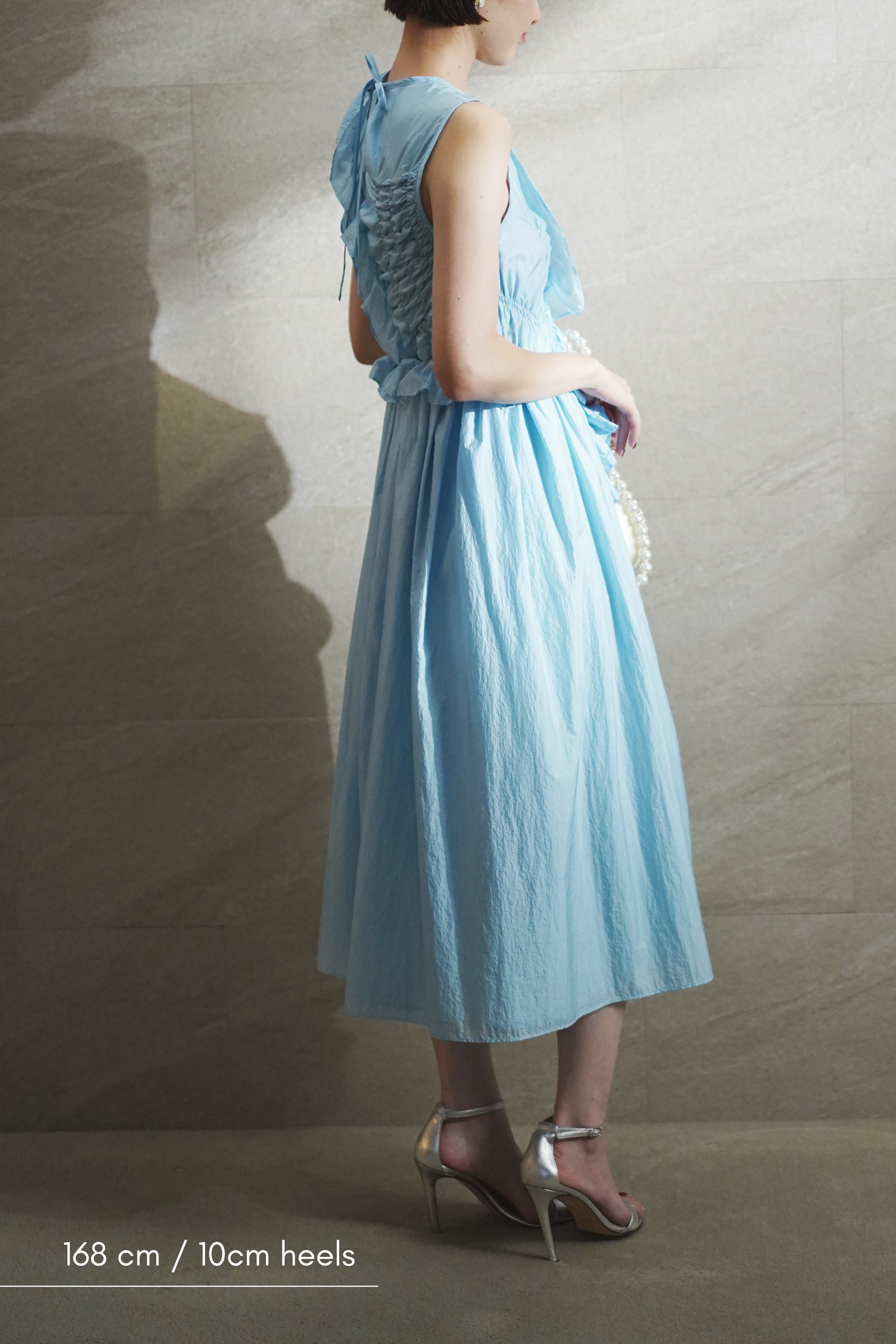 ラッフルとギャザーのディテールが目を惹くライトブルーのドレス。 柔らかなファブリックと背面のキーホールディテールが、Cecilie Bahnsenらしいモダンフェミニンを演出します。 パーティーやセレモニーで纏うだけで、特別感が際立つ一着です。
