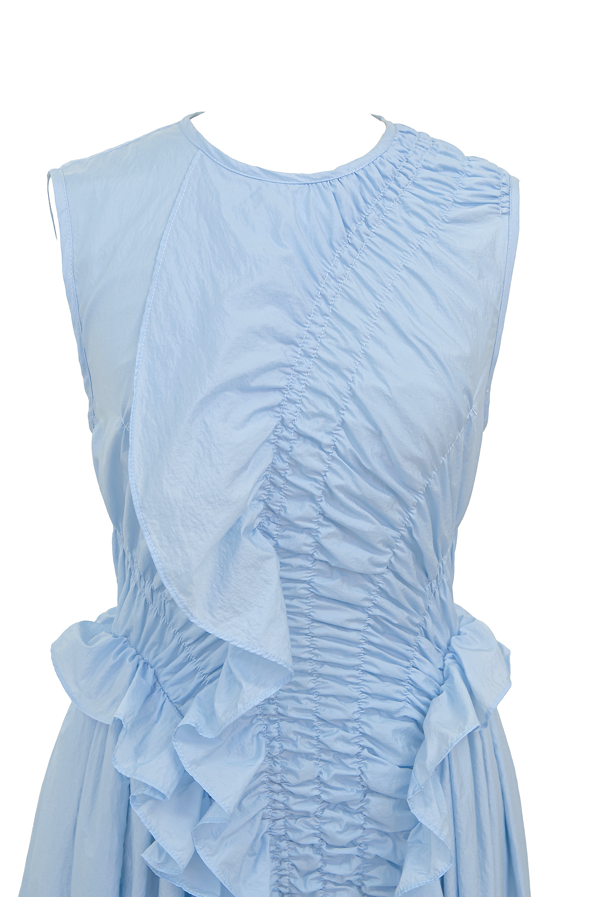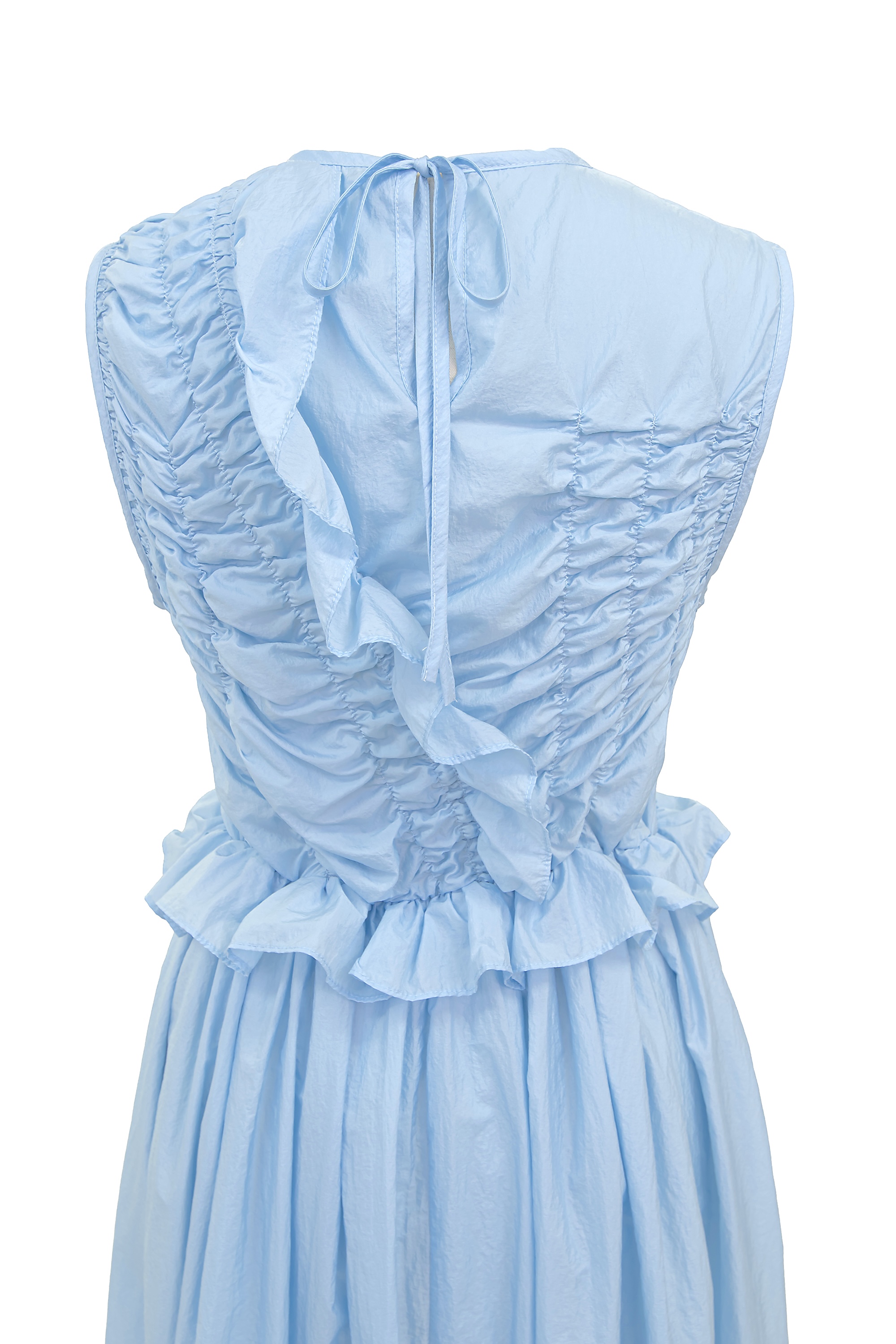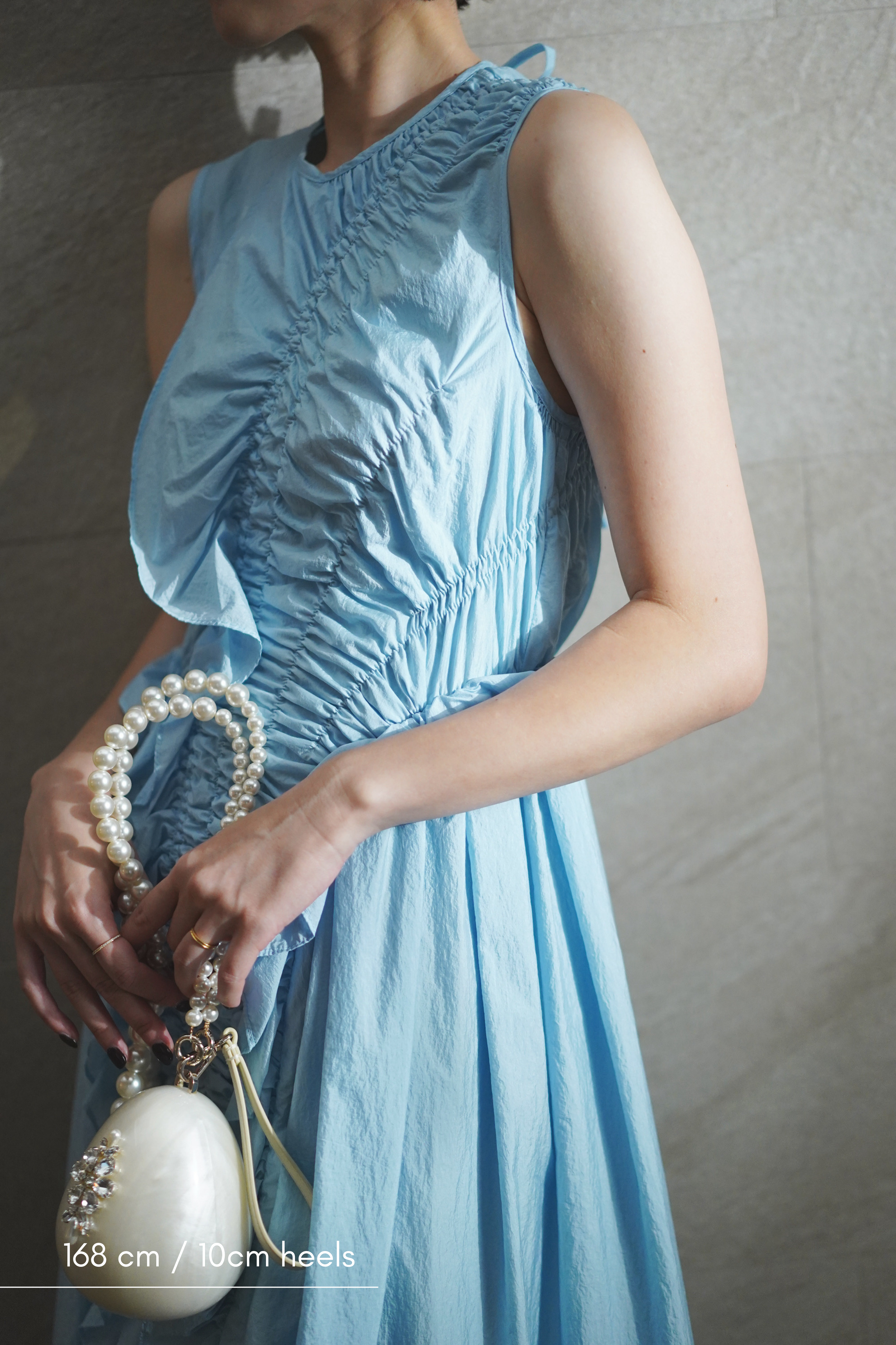 ラッフルとギャザーのディテールが目を惹くライトブルーのドレス。 柔らかなファブリックと背面のキーホールディテールが、Cecilie Bahnsenらしいモダンフェミニンを演出します。 パーティーやセレモニーで纏うだけで、特別感が際立つ一着です。