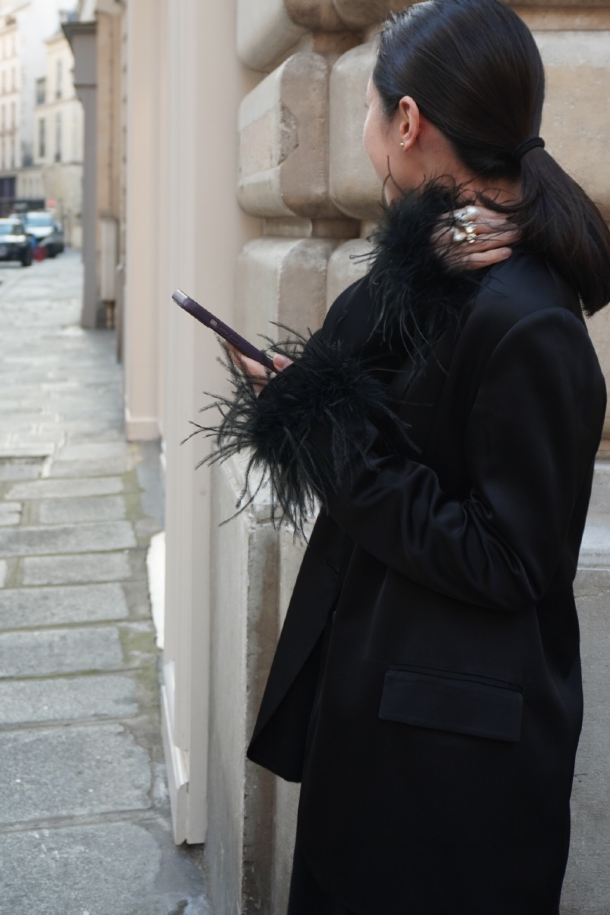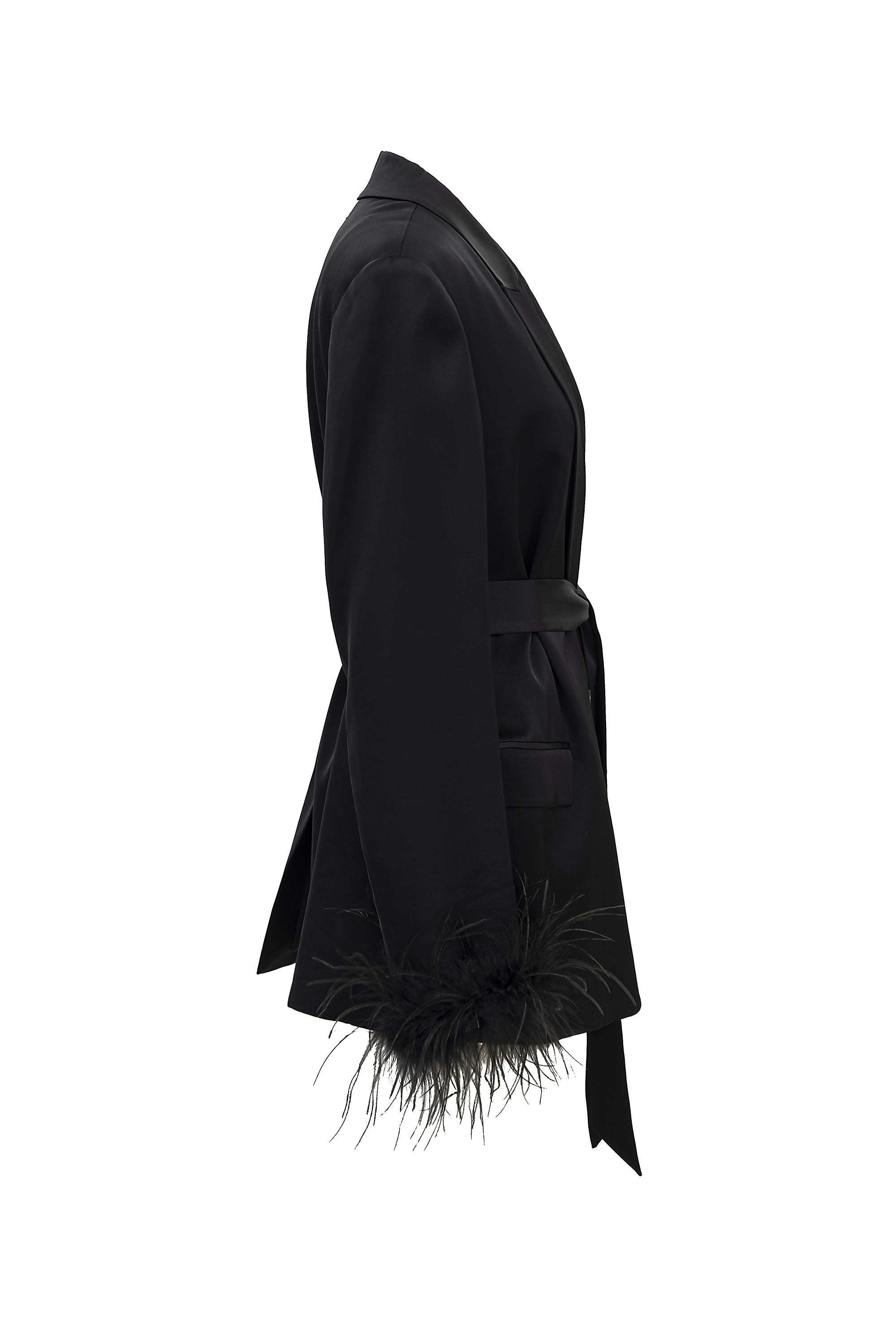 パーティーシーンでワンランクお洒落に決まるジャケット。袖にあしらわれたフェザーがポイントです。肩幅が細めのデザインのため袖にボリュームあるデザインのドレスやトップスをお召になる場合は肩がけにしてお羽織いただくこともできます。ツヤ感のある素材なのでフォーマルなシーンにも品よくワンポイントアクセントをプラスしていただけます。付属のベルトでウエストマークすることもでき、スタイルアップも叶えてくれます。